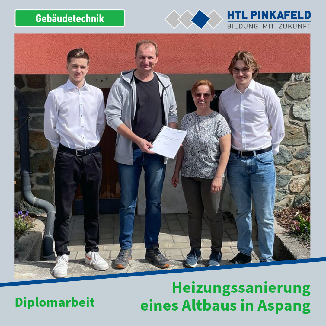 Die Diplomarbeit „Heizungssanierung eines Altbaus in Aspang“ wurde von den Gebäudetechnik-Maturanten Thomas Peinthor und David Prasch für Fam. Peinthor in Aspang erarbeitet und Anfang April an die Auftraggeber übergeben.Ziel der Arbeit war es, für das Bestandsgebäude, welches als sanierter Altbau eingestuft werden kann, ein neues Heizungssystem zu planen, das den Wünschen und Bedürfnissen der Bewohner entspricht, gleichzeitig aber auch nachhaltig und wirtschaftlich sein sollte.