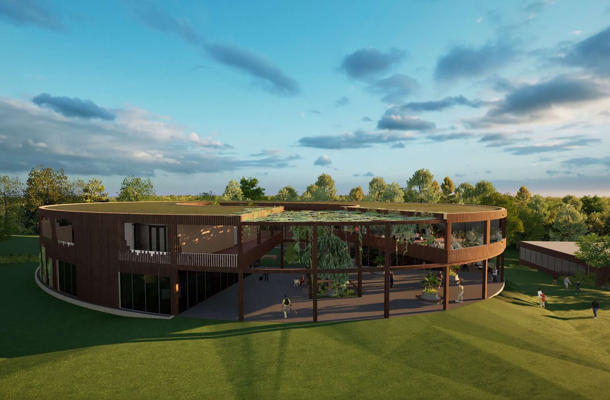 Die beiden Schülerinnen der Hoch- bzw. Holzbauklasse planten den Marienhof, ein Trainingszentrum für den Stock- und Bogenschießsport. Ziel dabei war es, ein Gebäude zu konzipieren, das optimale Trainingsbedingungen bietet, um bei beiden Sportarten Wettkampfniveau erreichen zu können. Neben den einzelnen Trainingsbereichen bietet das Zentrum auch Übernachtungsmöglichkeiten und Verpflegung für Sportler und auch Zuschauer an. Bei der Gestaltung der Gebäude durch unterschiedliche Gebäudeformen und der Wahl einer Holzfassade erreichte man eine harmonische Einbettung in die bewaldete Umgebung.