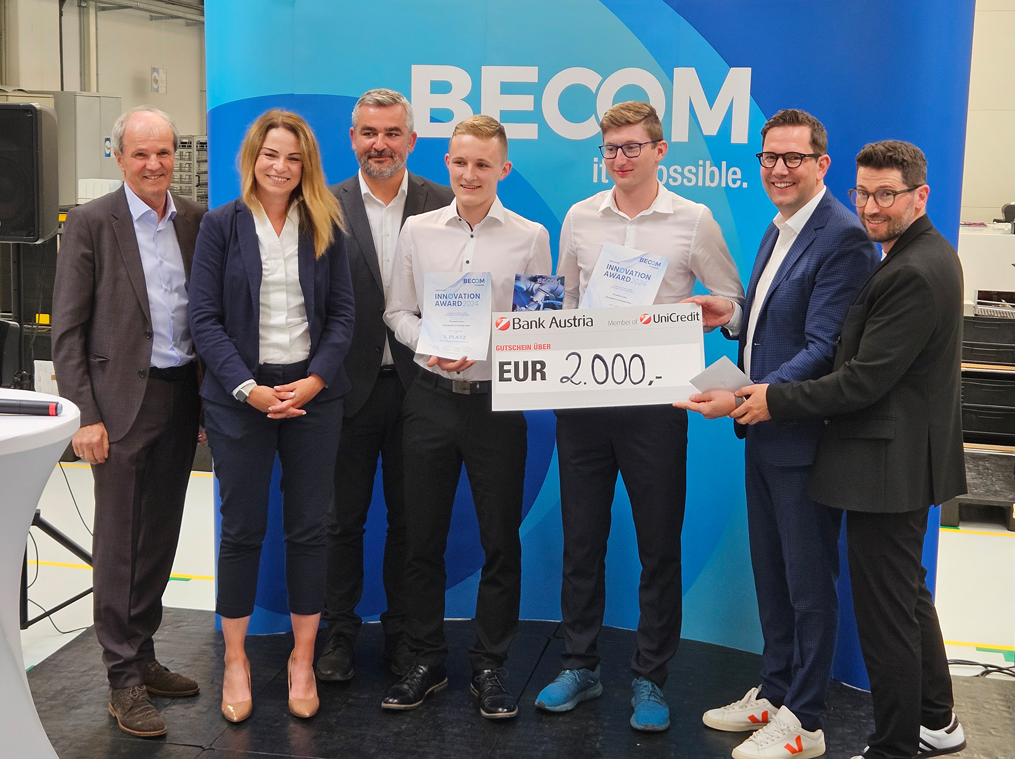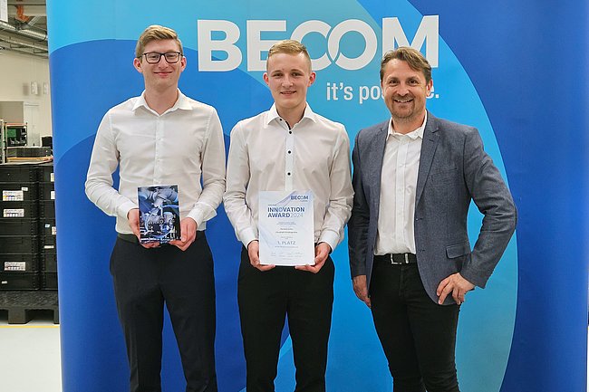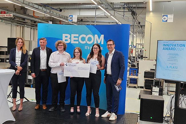 Am 22. Mai 2024 holte die im burgenländischen Hochstraß ansässige „BECOM Electronics GmbH“, langjähriger Bildungspartner der Abt. Elektronik und Technische Informatik, mit dem „Innovation Award 2024“ wieder herausragende Elektronik-Diplomarbeiten vor den Vorhang. In einem mehrstufigen Prozess wurden die innovativsten Projekte begutachtet und gereiht. Vor hochrangigen Vertretern von Industrie und Wirtschaft überreichte Landesrat Heinrich Dorner schließlich den mit € 2.000 dotierten ersten Preis an das Team „Dynamische Ladestromregelung für E-Autos“.