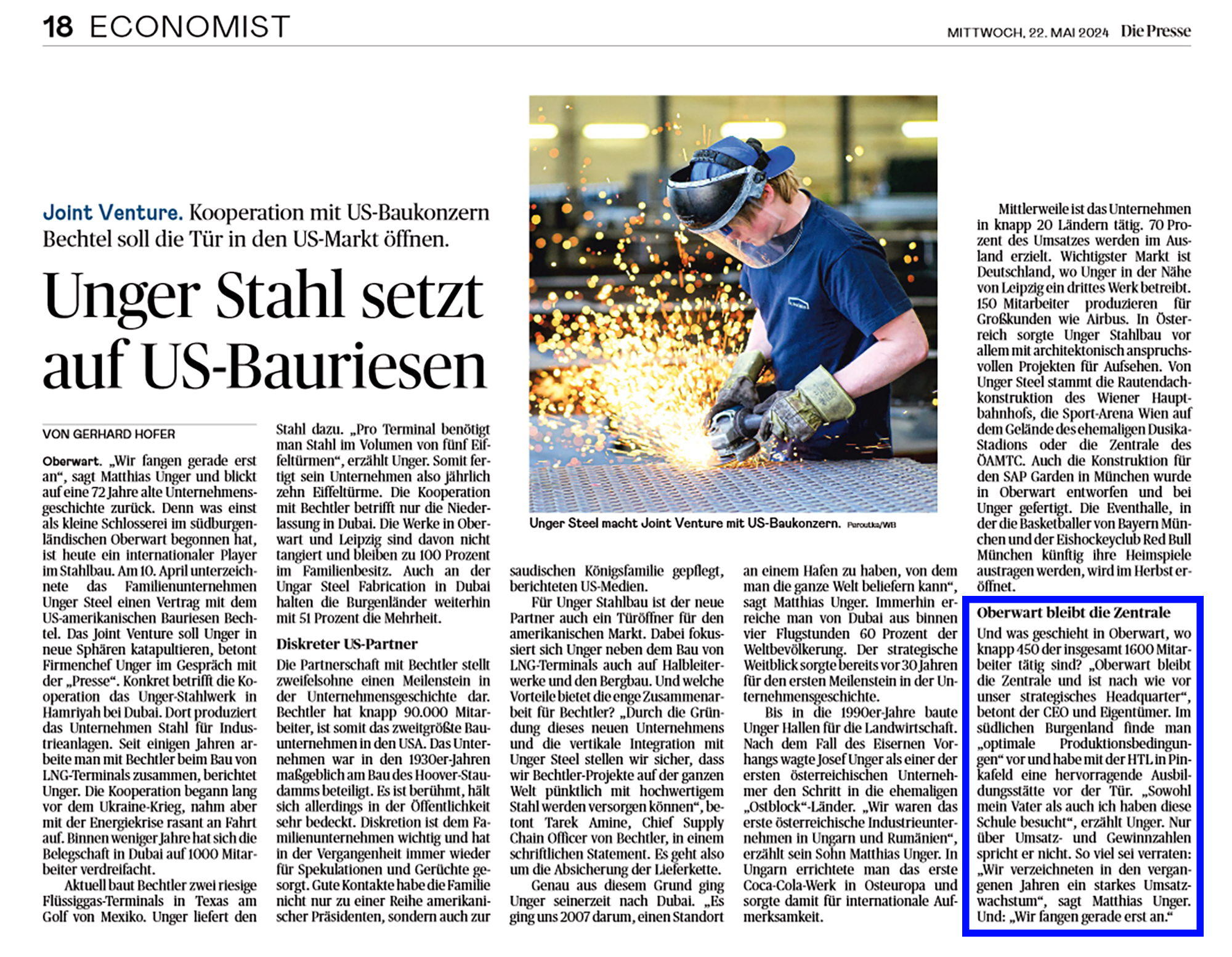 Ing. Mag. (FH) Matthias Unger, CEO und Eigentürmer von „Unger Steel“ sowie Präsident des Fördervereins „HTL PLUS – Bautechnik“ gab in der Mittwochausgabe von „Die Presse“ ein Interview über die Kooperation mit dem US-Baukonzern Bechtel. Darin bestätigte er, dass Oberwart die Zentrale und das strategische Headquartier bleibt und verwies u.a. auf die „hervorragende Ausbildungsstätte vor der Tür“, die er selbst und auch bereits sein Vater besucht haben.