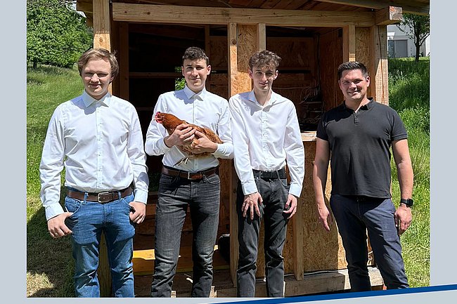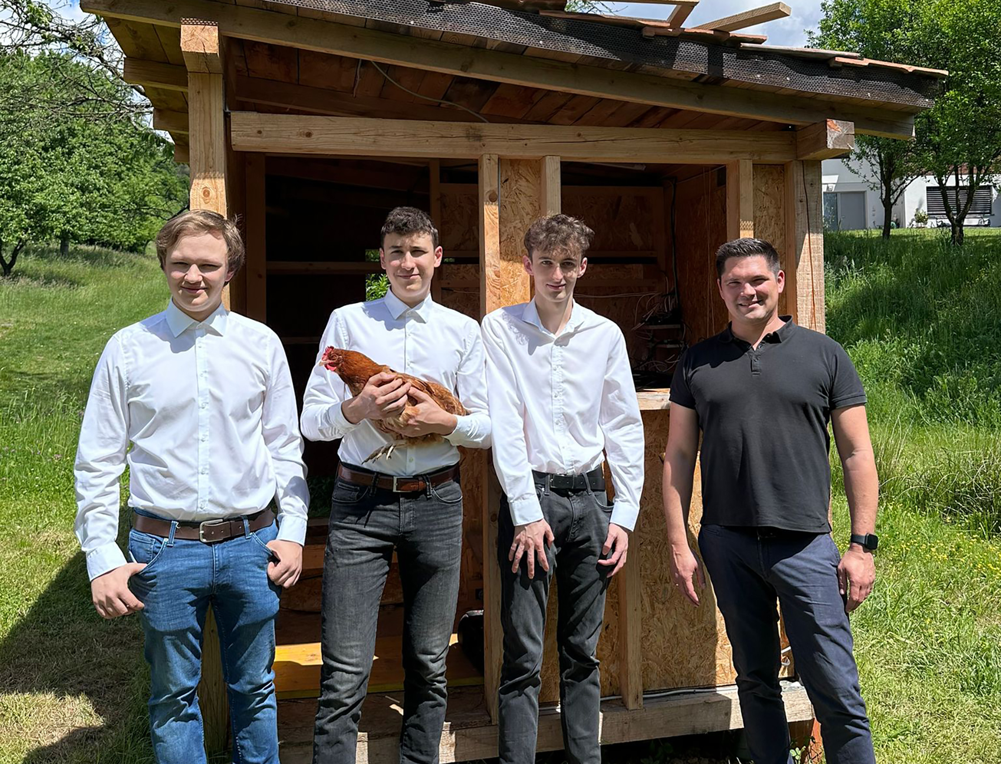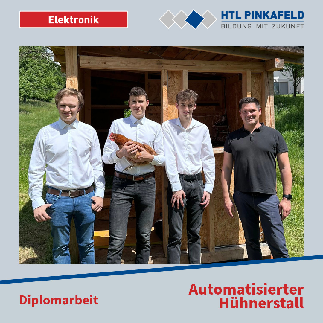 Die Diplomarbeit „Automatisierter Hühnerstall“, verfasst von den Elektronik-Maturanten Paul Friedl, David Dopler und Lukas Stocker, wurde Anfang April an den Auftraggeber DI Kurt Friedl übergeben. Die Arbeit wurde unter der Betreuung von Prof. Christian Josef Paar durchgeführt.
