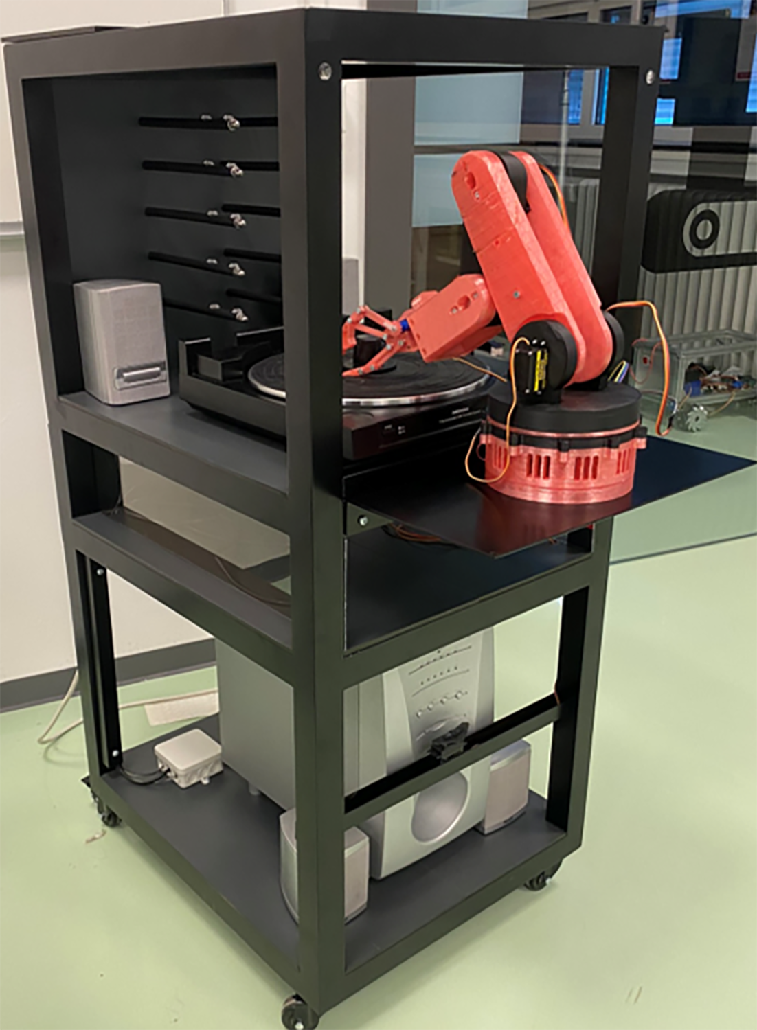 Ziel der Arbeit war es, einen handelsüblichen Schallplattenspieler zu automatisieren. Durch die Website-Steuerung der Jukebox können Benutzer Funktionen wie Ein- und Ausschalten sowie die Lautstärkeregelung bequem und intuitiv nutzen. Die auf der Website ausgewählte Schallplatte wird mit einem selbst entwickelten Greifarm, welcher 3D gedruckt wurde, auf den Drehteller gelegt. Die Bewegung des Greifarmes erfolgt mit Servo- und Schrittmotoren, wobei die Ansteuerung der Motoren mit einem Mikrocontroller realisiert wurde. Zur Kommunikation zwischen der Website und der „Jukebox“ wird ein ESP32 verwendet. Um verschiedene Lichteffekte erzeugen zu können, wurden LED Streifen an den Rahmen der „Jukebox“ angebracht.