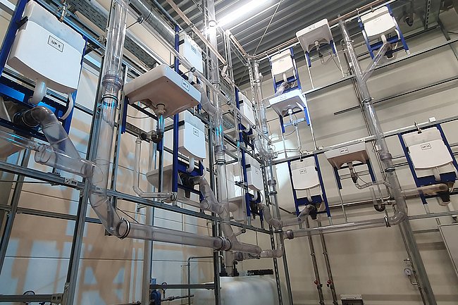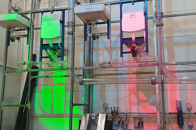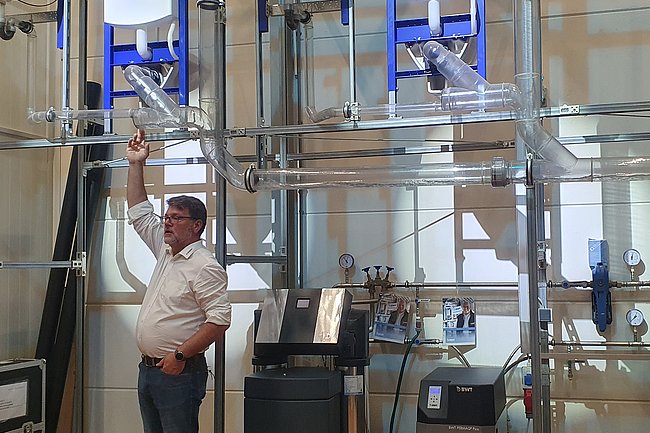 Nach dem Mittagessen wurden wichtige Planungsgrundlagen in Hinsicht Trinkwasserhygiene, Schallschutz und Brandschutz in der Sanitärtechnik und Verlegerichtlinien in der Abwassertechnik besprochen. Abschließend wurde der Abwasserturm besichtigt, wo Fehler in der Verlegung von Abwasserleitungen veranschaulicht und bewusst gemacht wurden. Abgerundet haben das Programm einige Anekdoten aus dem Erfahrungsschatz von Harald Hofko, der dadurch sehr lebendig sein Know How vermitteln konnte.