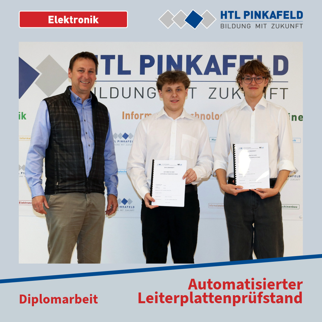 Im Mai wurde die Abschlussarbeit „Automatisierter Leiterplattenprüfstand“ der Elektronik-Maturanten Tobias Brünner und Nick Handler an die Firma Lumitech Lighting Solution übergeben. Diese Arbeit an der HTL Pinkafeld wurde unter der Betreuung von Prof. Markus Mandl, MSc durchgeführt.
