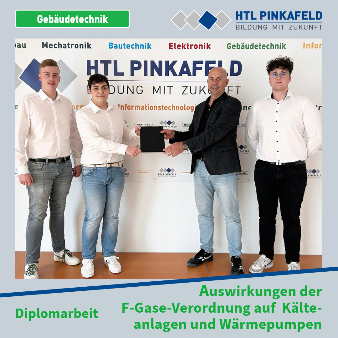 Kürzlich wurde die Diplomarbeit „Analyse der Auswirkung und Einhaltung der F-Gase-Verordnung auf den Einsatz von Kälteanlagen und Wärmepumpen“ von den Gebäudetechnik-Maturanten Jakob Dully, Simon Freißmuth und Nico Schrantz an den Auftraggeber HTL Pinkafeld übergeben. Betreut wurde diese Diplomarbeit von Prof. Erich Draxler.