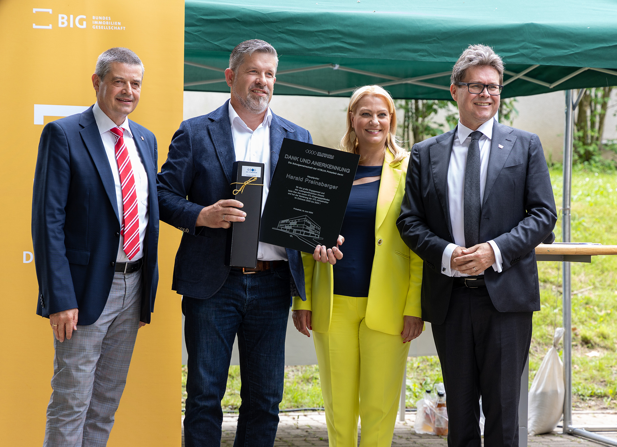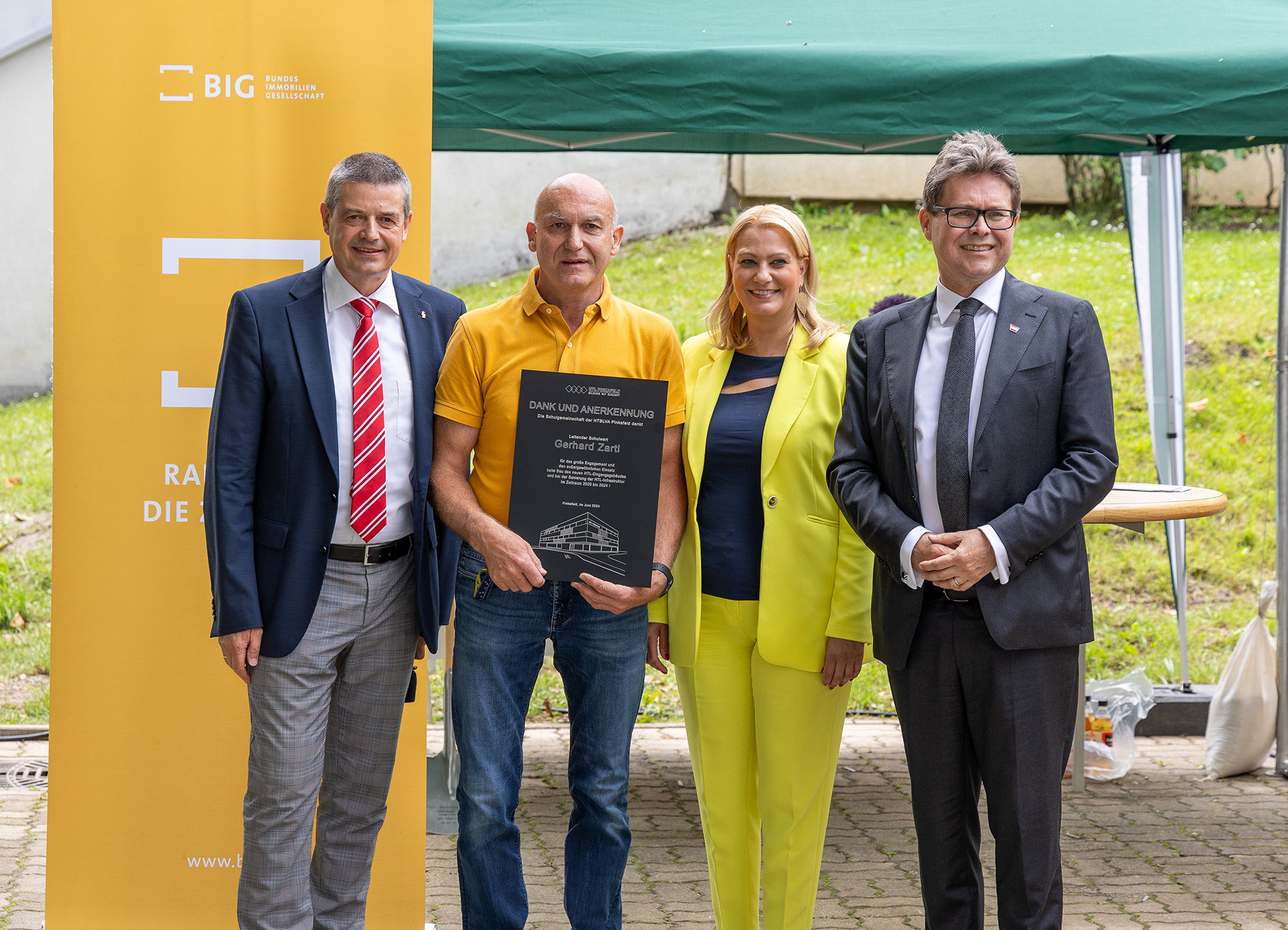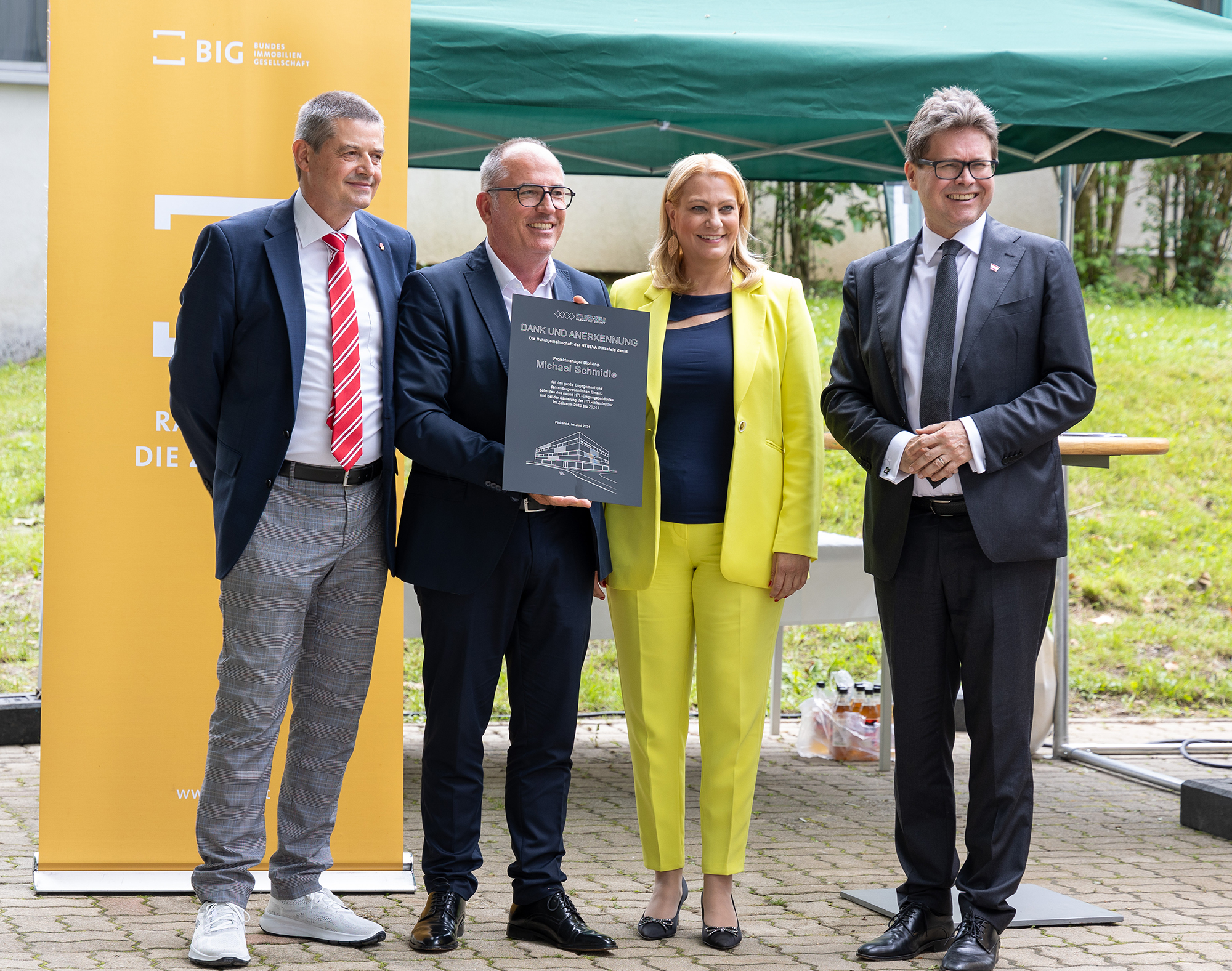 Direktor Wilfried Lercher war es sehr wichtig, die gute Zusammenarbeit aller Projektbeteiligten in den Vordergrund zu stellen. Als Anerkennung ihres großen Engagements wurden Projektmanager Michael Schmidle (BIG), Hauptpolier Harald Preinsberger (GRANIT) und Leitender Schulwart Gerhard Zartl in Form einer eigens von der Bautechnik-Abteilung designten „Dank und Anerkennung“-Urkunde ausgezeichnet. Die ebenfalls für diese Auszeichnung vorgesehenen DI Ingomar Findenig vom Ausführungsplaner „Pilz und Partner Ziviltechniker GmbH“ und Bildungsdirektor a.D. Hofrat Heinz Josef Zitz waren leider beruflich verhindert.