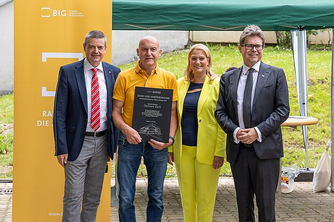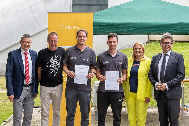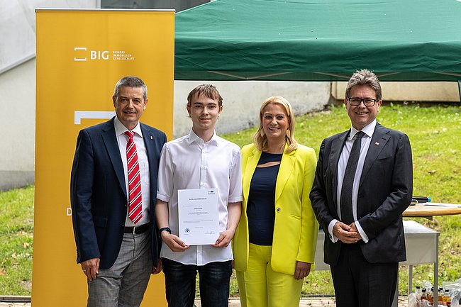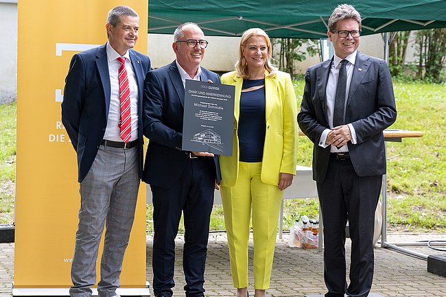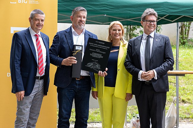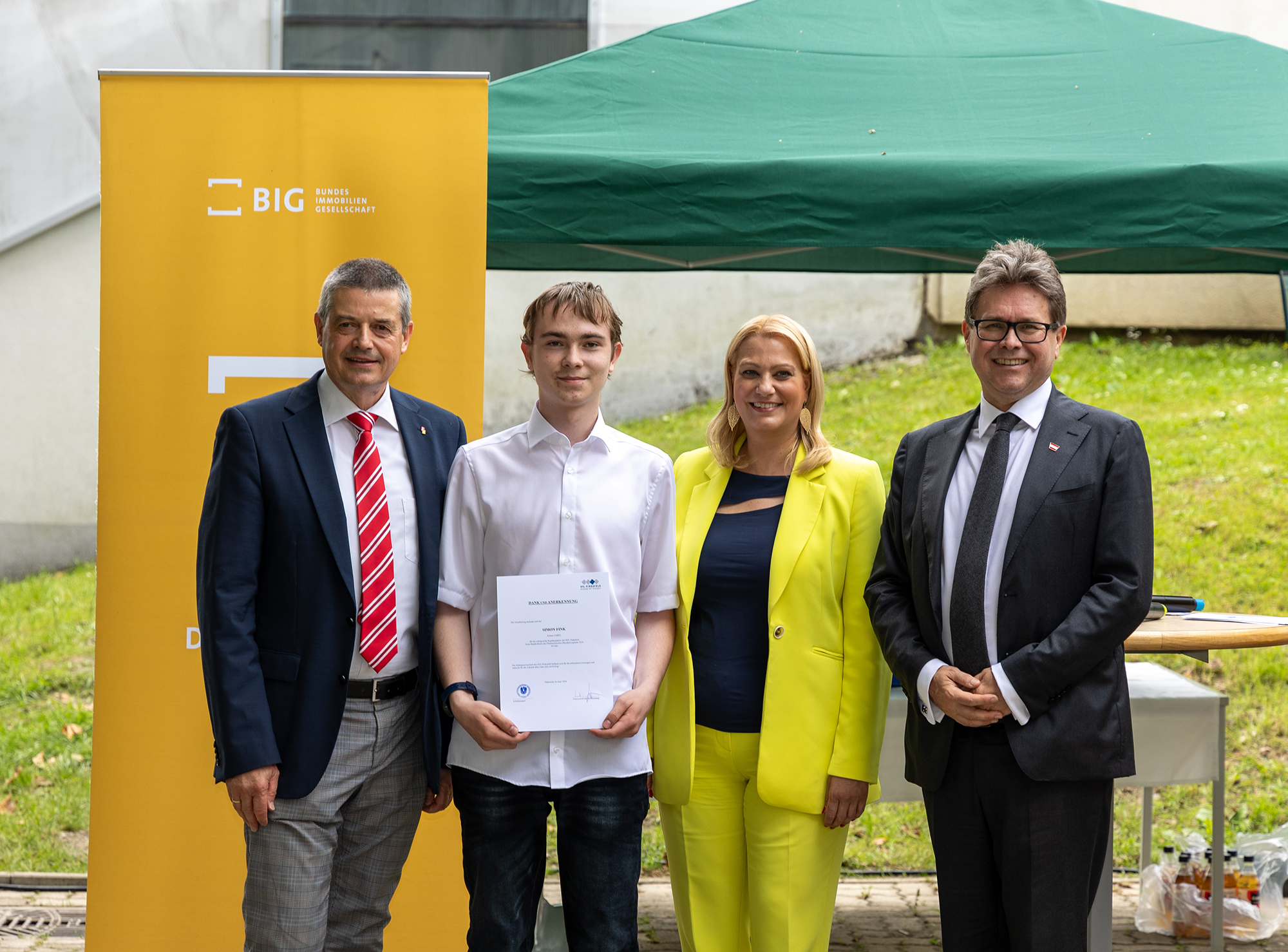 Direktor Wilfried Lercher war es sehr wichtig, die gute Zusammenarbeit aller Projektbeteiligten in den Vordergrund zu stellen. Als Anerkennung ihres großen Engagements wurden Projektmanager Michael Schmidle (BIG), Hauptpolier Harald Preinsberger (GRANIT) und Leitender Schulwart Gerhard Zartl in Form einer eigens von der Bautechnik-Abteilung designten „Dank und Anerkennung“-Urkunde ausgezeichnet. Die ebenfalls für diese Auszeichnung vorgesehenen DI Ingomar Findenig vom Ausführungsplaner „Pilz und Partner Ziviltechniker GmbH“ und Bildungsdirektor a.D. Hofrat Heinz Josef Zitz waren leider beruflich verhindert.