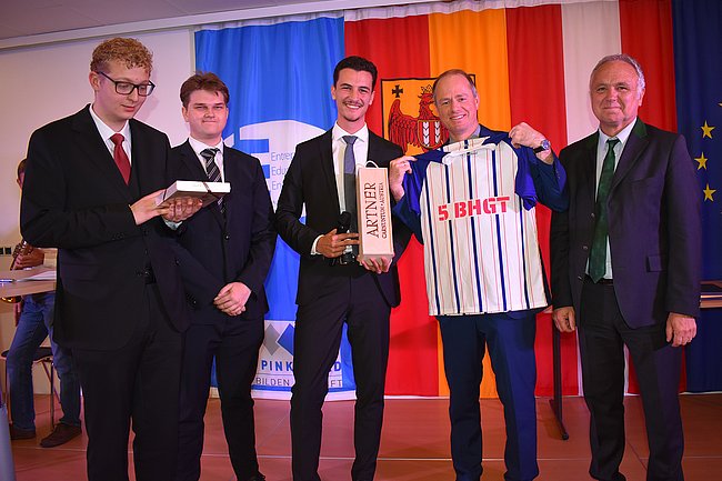 Die Jahrgangsvorstände Prof. Harald Schneller (5AHGT), Prof. Bernhard Bruckner (5BHGT) und Ing. Horst Reicher (4AFMA) sowie Studienkoordinator Prof. Wilhelm Zapfel (8YxGT) freuten sich mit ihren Absolventinnen und Absolventen über weiße Fahnen und die Auszeichnungen.