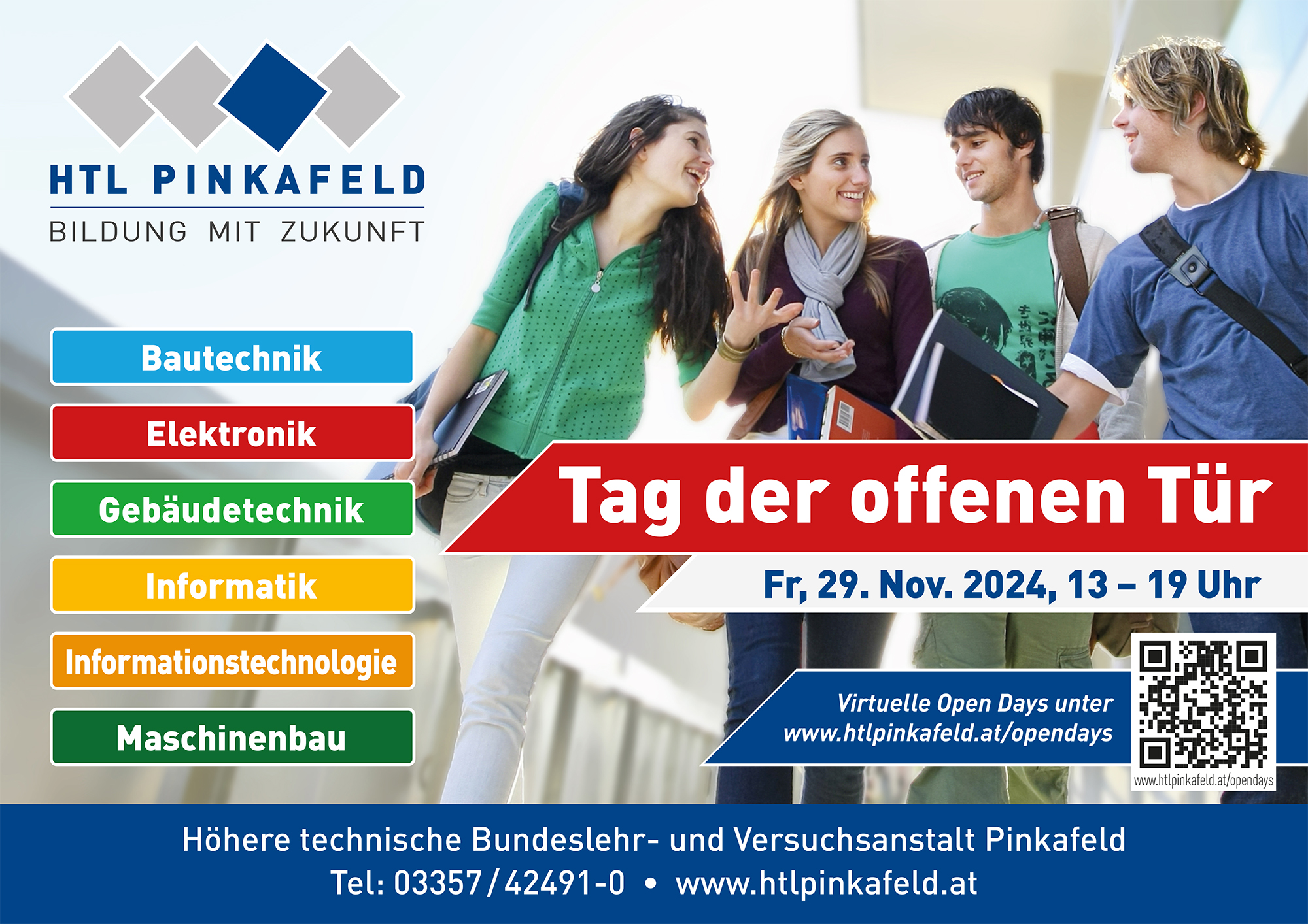 Am Freitag, 29. November 2024, findet von 13 bis 19 Uhr der traditionelle „Tag der offenen Tür“ der #HTLPinkafeld statt. Dort präsentieren die vier Abteilungen Bautechnik, Elektronik, Gebäudetechnik und Informatik / Informationstechnologie ihre jeweiligen Ausbildungsschwerpunkte sowie neue technische Projekte und Innovationen und stehen für alle Fragen zur Verfügung.