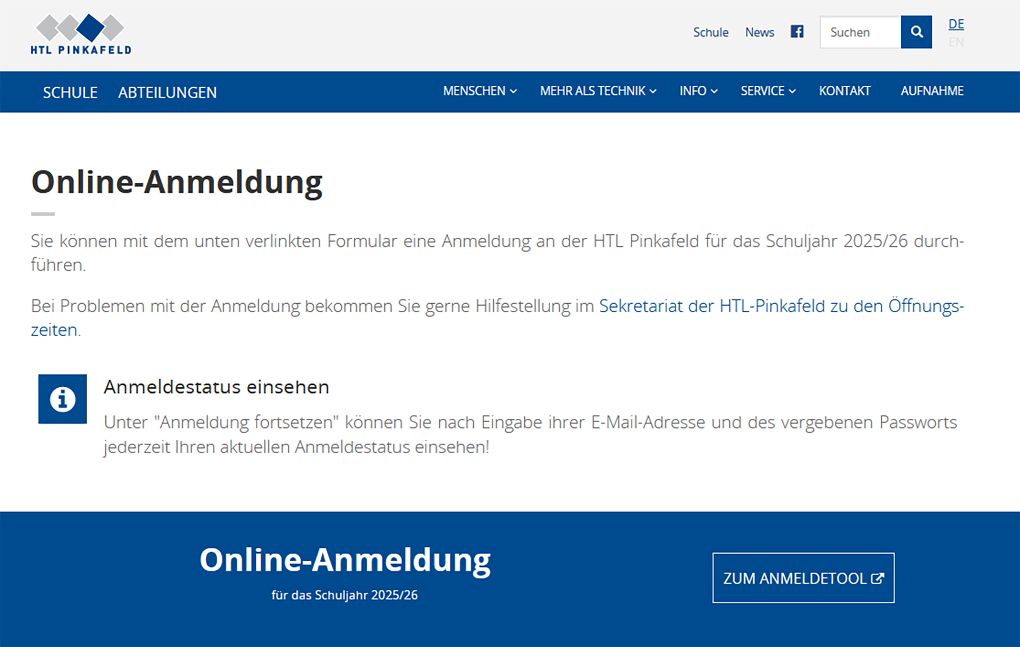 Die Anmeldung für das nächste Schuljahr 2025/26 an der HTL Pinkafeld wurde freigeschaltet und ist jederzeit online unter https://www.htlpinkafeld.at/schule/aufnahme/ möglich.
