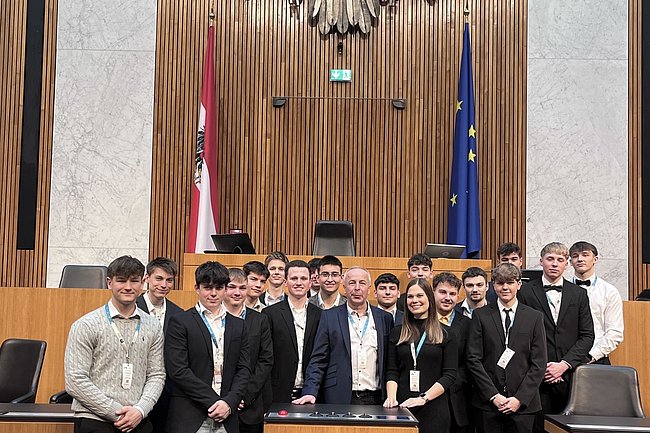Nach einem Besuch der „Skylobby“ und einem gemeinsamen Mittagessen vor Ort ging es weiter zum Wiener Parlament. Dort erwartete die Schüler nicht nur eine informative Führung durch das imposante Gebäude, sondern auch ein exklusiver Blick hinter die Kulissen – mit besonderem Fokus auf die Haustechnik, die in ihrer Größe und Komplexität große Faszination hervorrief.