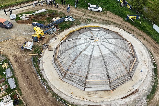 Das Projekt wird in einer neuen Bauweise für Schalentragwerke umgesetzt, die auf eine pneumatische Schalung basiert. Weiters wurde leichtere Bewehrung mit Basaltinhalten eingesetzt.