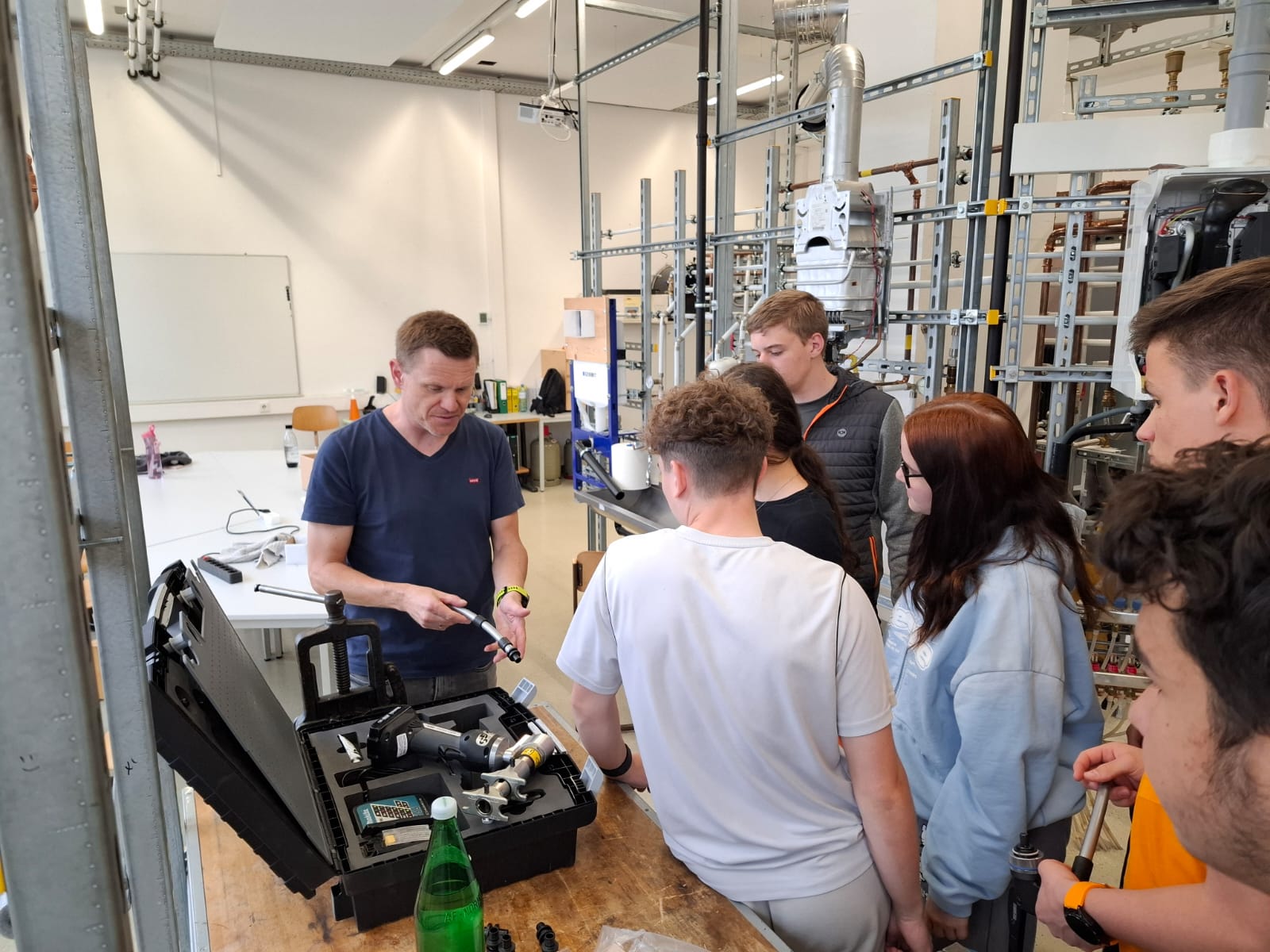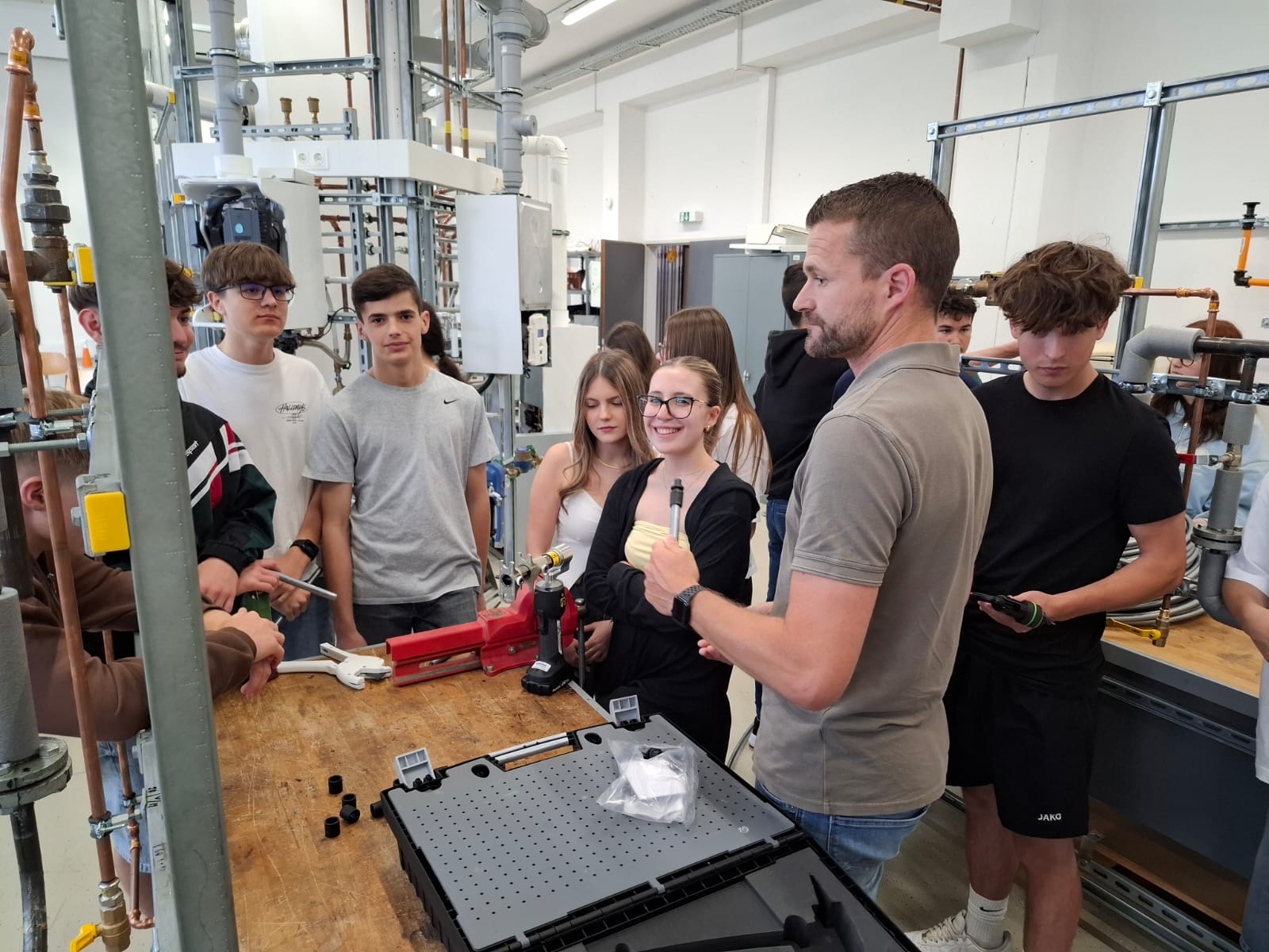 Zu Beginn erhielten die Klassen einen informativen Vortrag über den Einsatz und die Verbindungstechniken von Verbundrohren. Weiters wurden Produktneuheiten vorgestellt.