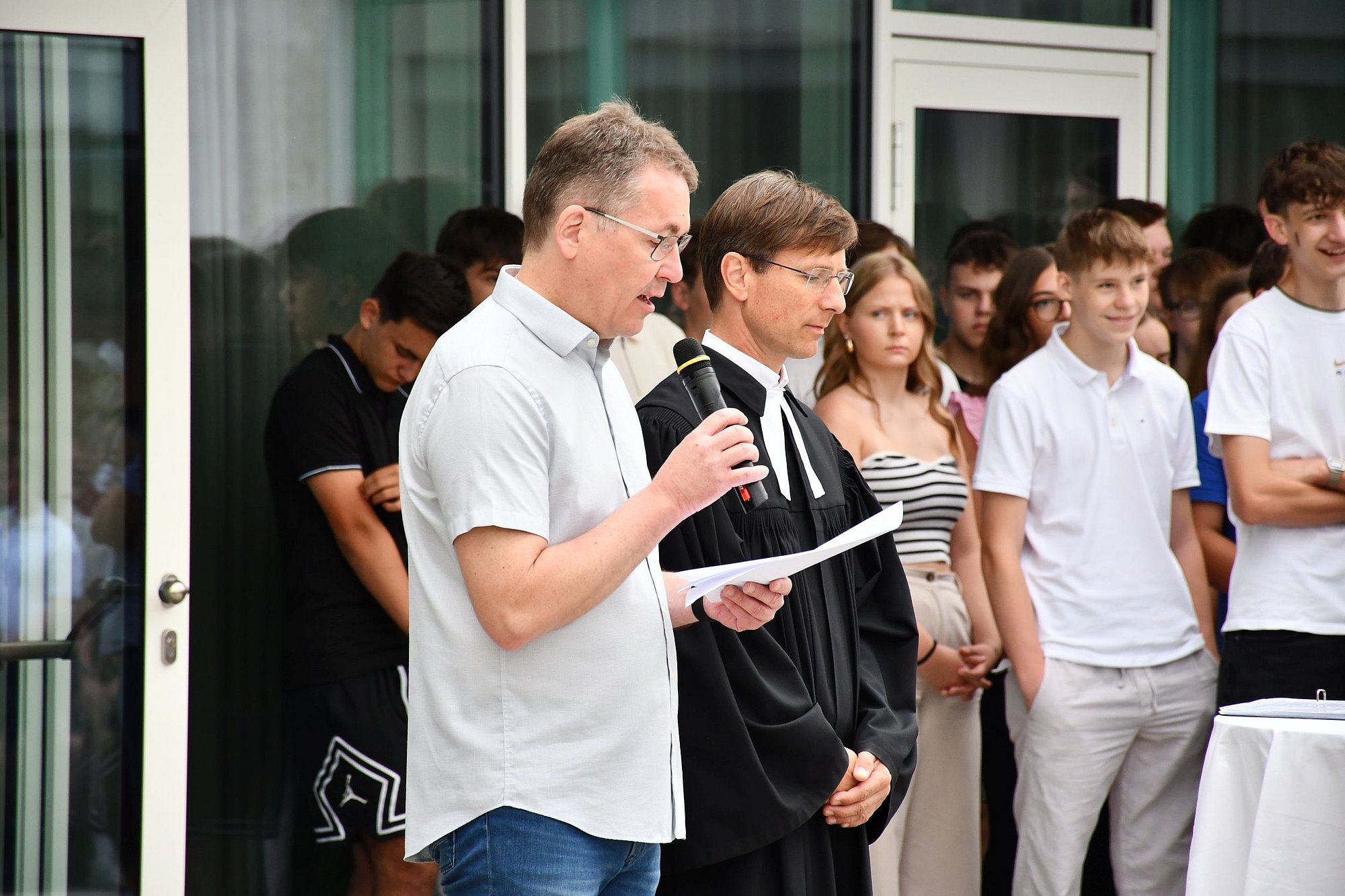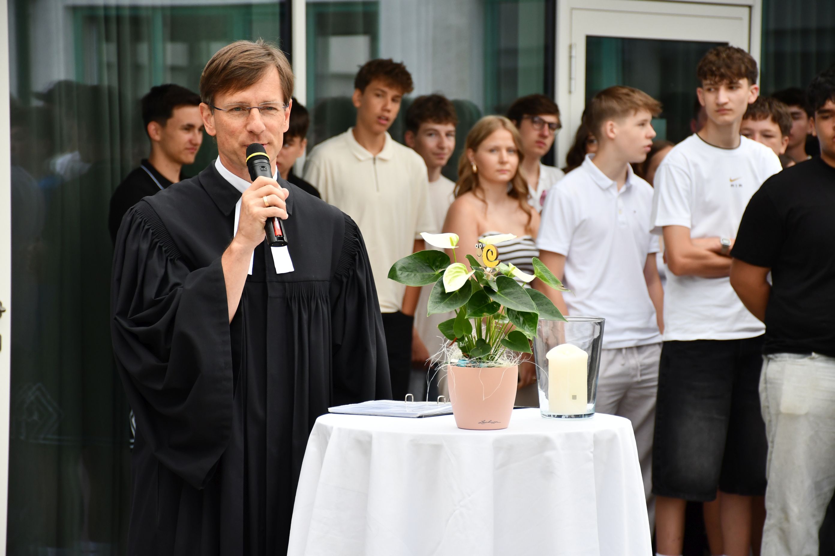 Carsten Merker-Bojarra, evangelischer Religionslehrer und Pfarrer, leitete die Feier zum Abschluss des Schuljahres 2024/2025. Er sprach dabei von Dank für Vergangenes und der Bitte für eine friedliche Zukunft und lud zum Gebet für die Opfer und Angehörigen des schrecklichen Angriffs auf das BORG Dreierschützengasse in Graz ein.