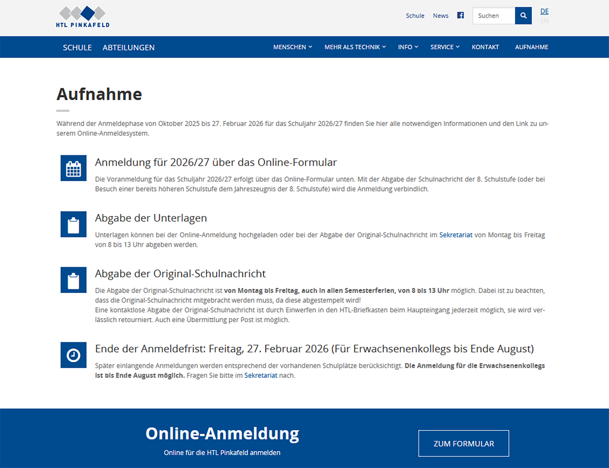 Die Anmeldung für das nächste Schuljahr 2026/27 an der HTL Pinkafeld wurde freigeschaltet und ist jederzeit online unter https://www.htlpinkafeld.at/schule/aufnahme/ möglich.