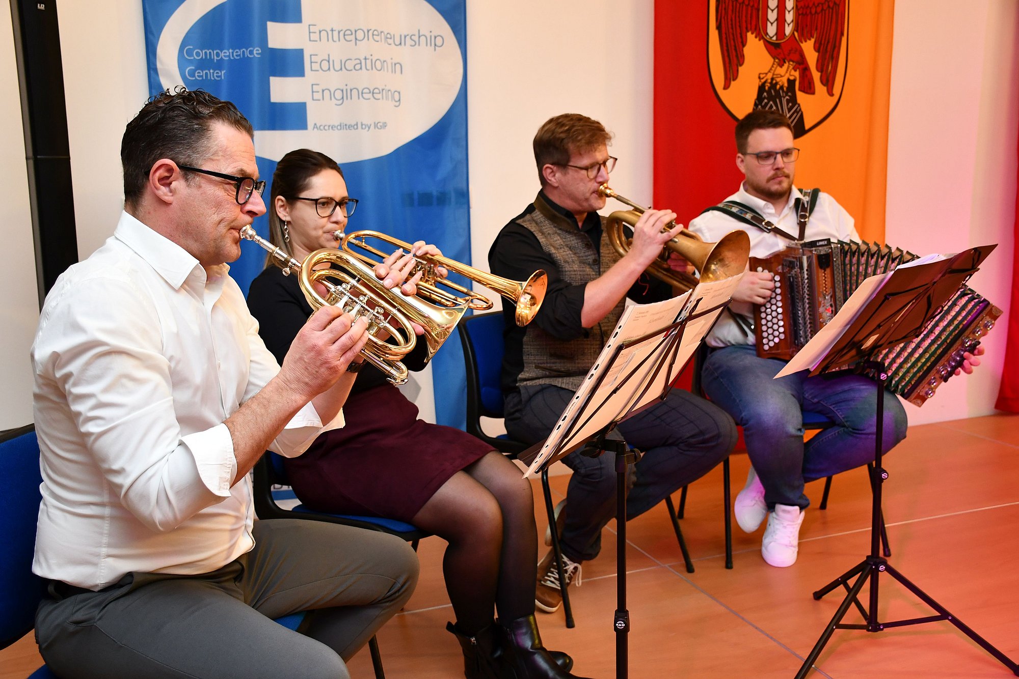Ein vierköpfiges Lehrerensemble umrahmte die Feierstunde musikalisch und Brenner Cobb, Fremdsprachenassistent für Englisch aus den USA, mit zwei Weihnachtsgedichten.