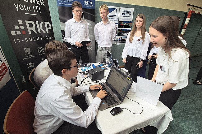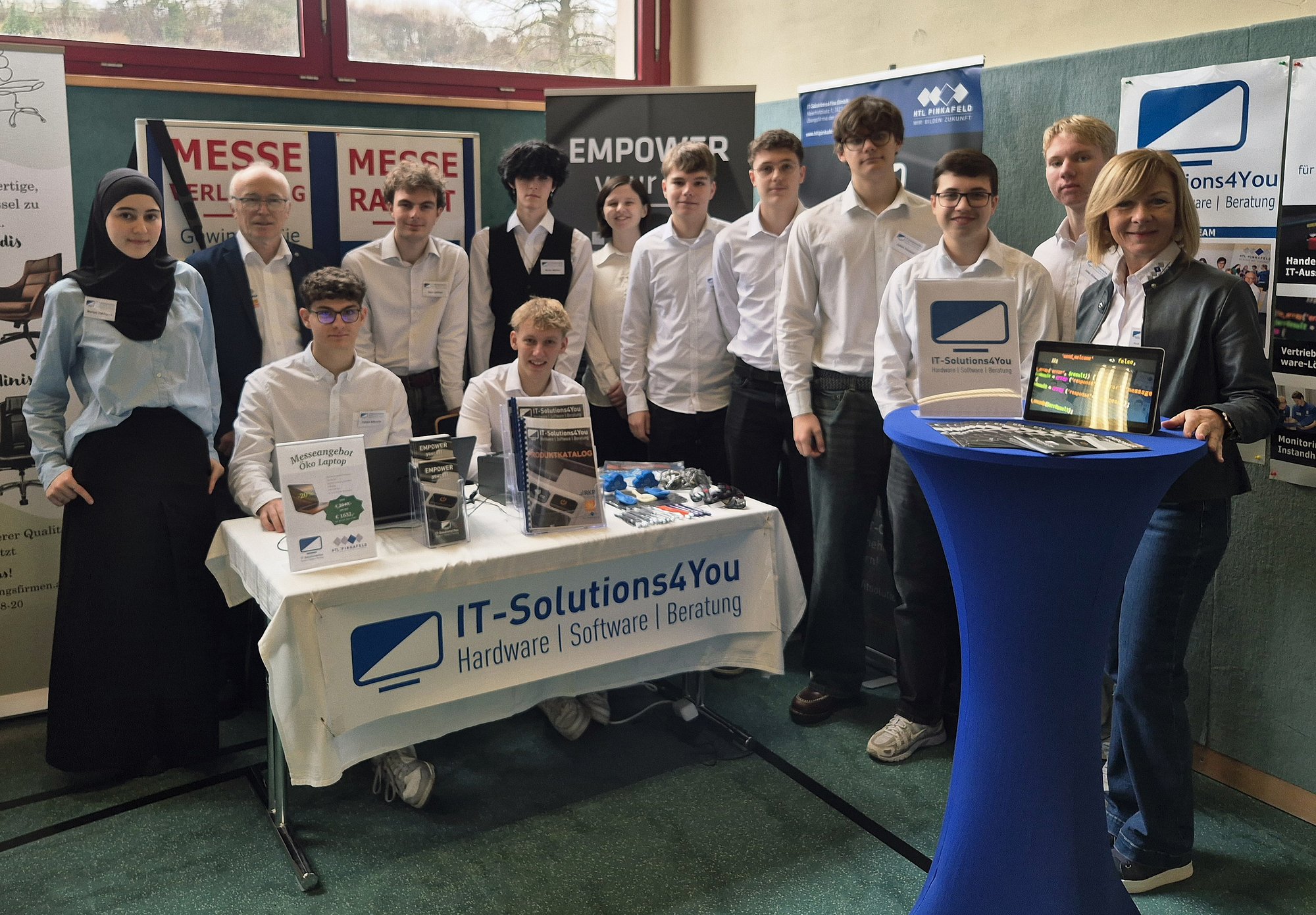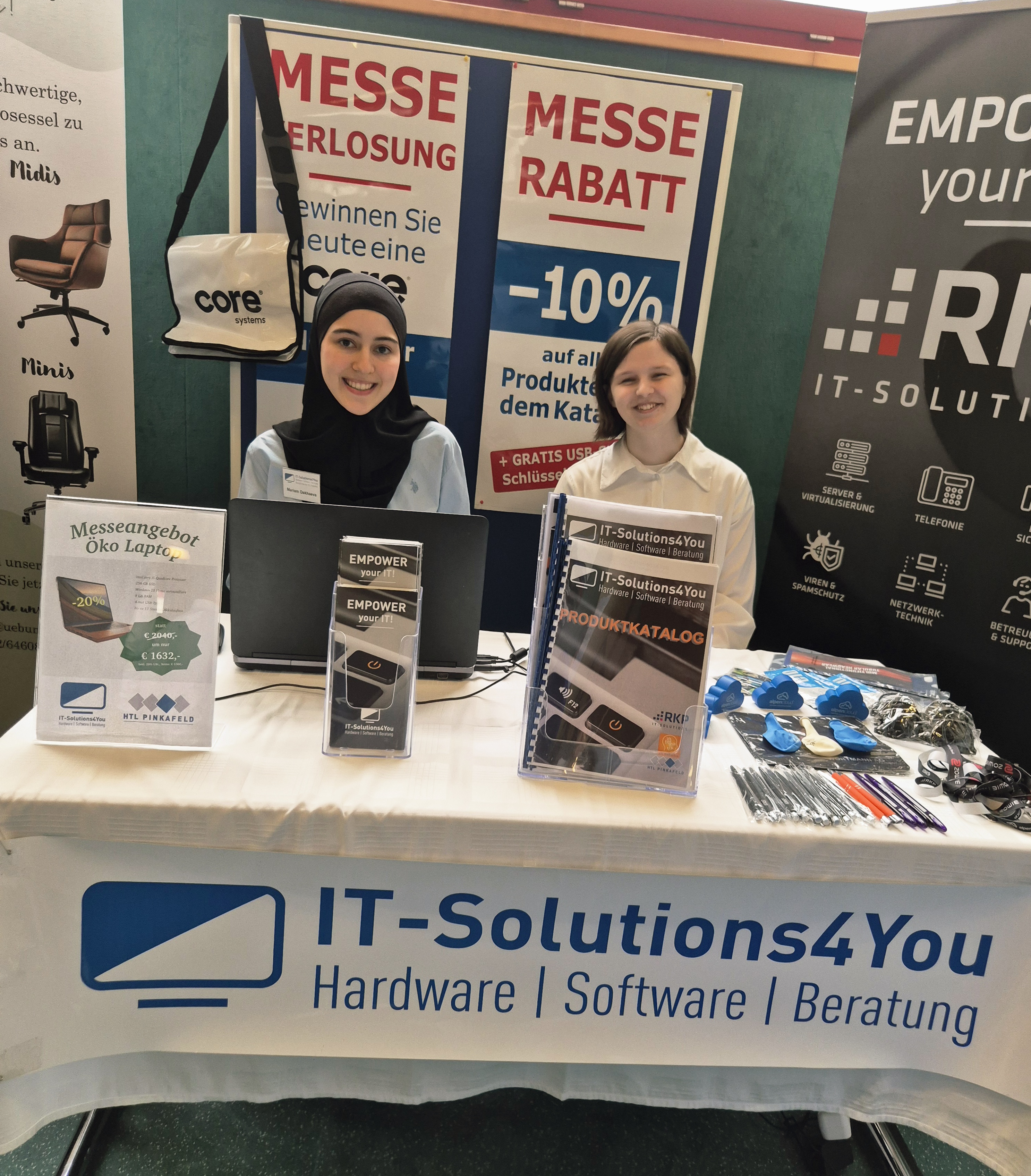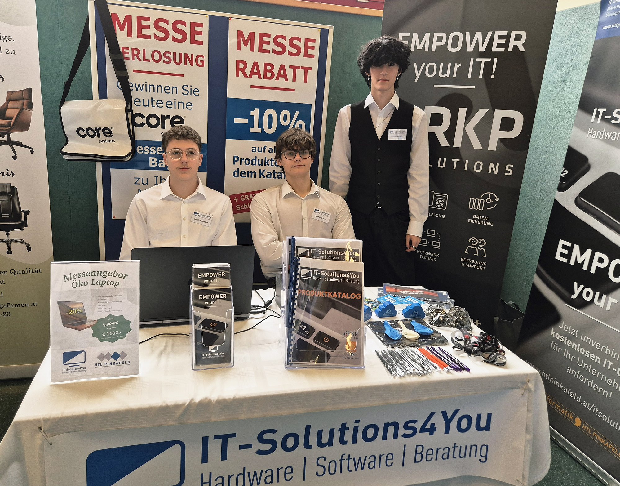 Das zwölfköpfige Schüler*innen-Team der IT-Solutions4You GmbH stellte ein vielfältiges Angebot aus dem Hard- und Softwarebereich vor. Gemeinsam mit den betreuenden Lehrenden gelang es, zahlreiche Interessierte zu überzeugen und mehrere Kaufabschlüsse zu erzielen. Der Messeauftritt zeigte eindrucksvoll, wie praxisnah unternehmerisches Denken an der HTL Pinkafeld vermittelt wird.