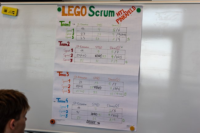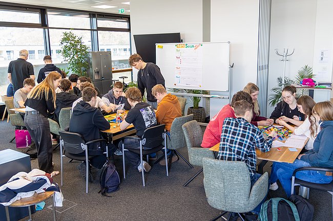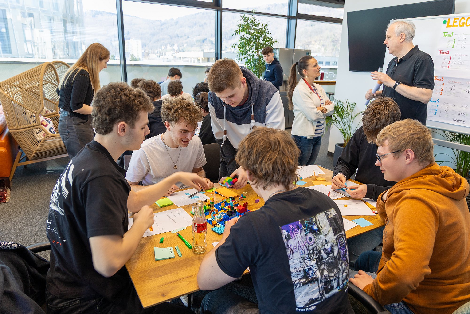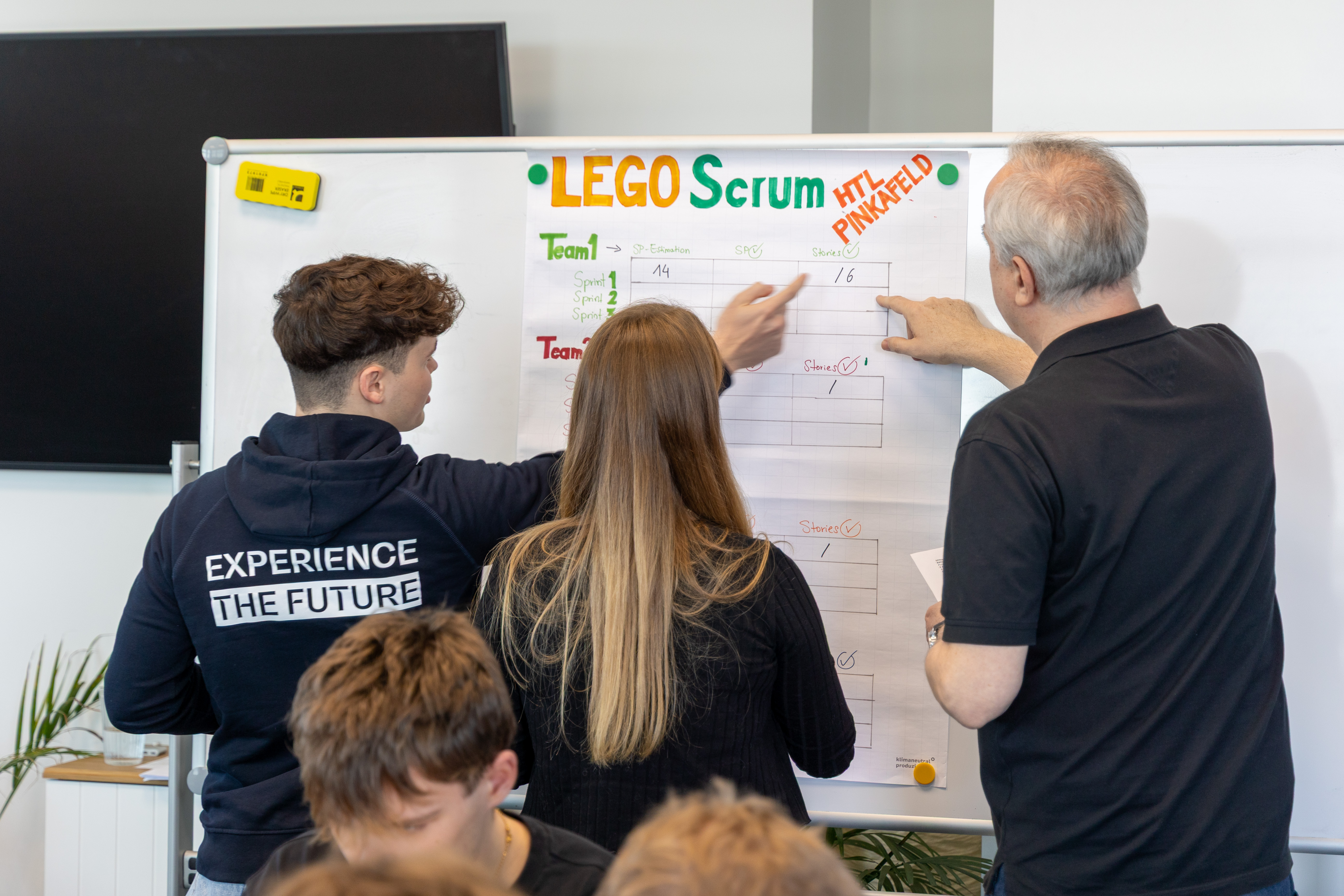 Ein besonderes Highlight war das Scrum-Spiel mit LEGO. In Teams arbeiteten die Schüler*innen unter echten Scrum-Bedingungen – mit klar definierten Rollen, Product Backlog und mehreren Sprints. Anfangsschwierigkeiten bei Kommunikation und Aufgabenplanung wichen schnell echter Teamarbeit und agiler Dynamik. Dieses spielerische Format machte die Prinzipien von Scrum greifbar und zeigte, wie eng Theorie und Praxis zusammenhängen.