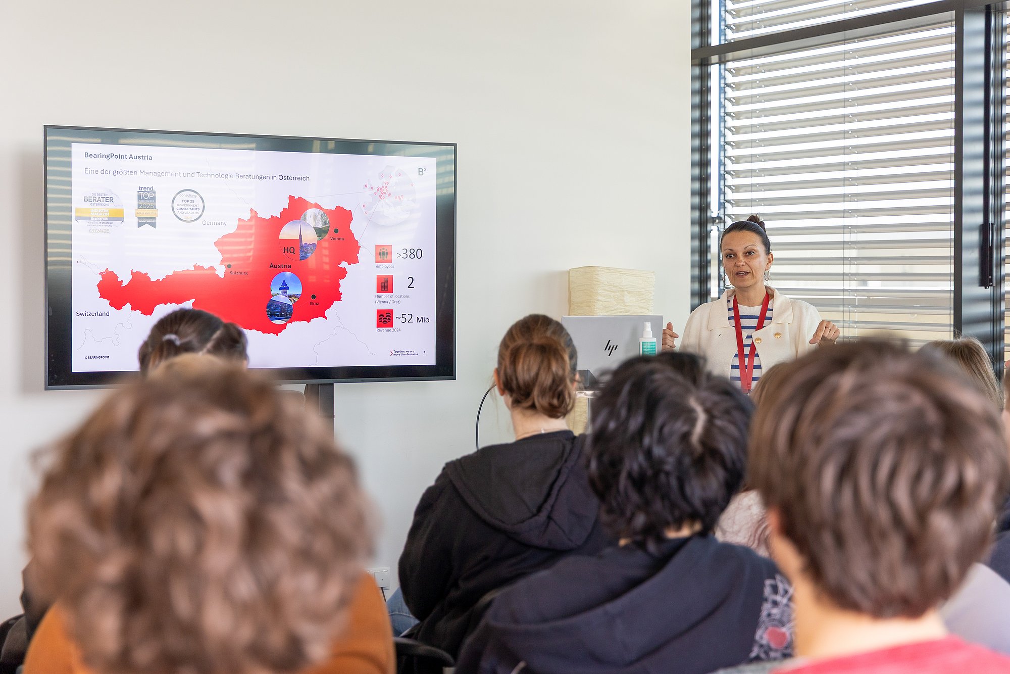 Nach einer Einführung in die Tätigkeitsbereiche von BearingPoint erhielten die Schüler*innen spannende Einblicke in den Berufsalltag eines Software Developers. Ein Mitarbeiter erzählte von seinem persönlichen Werdegang und gab authentische Eindrücke zu Teamarbeit, Kommunikation und lebenslangem Lernen – zentrale Aspekte im modernen Software Engineering.