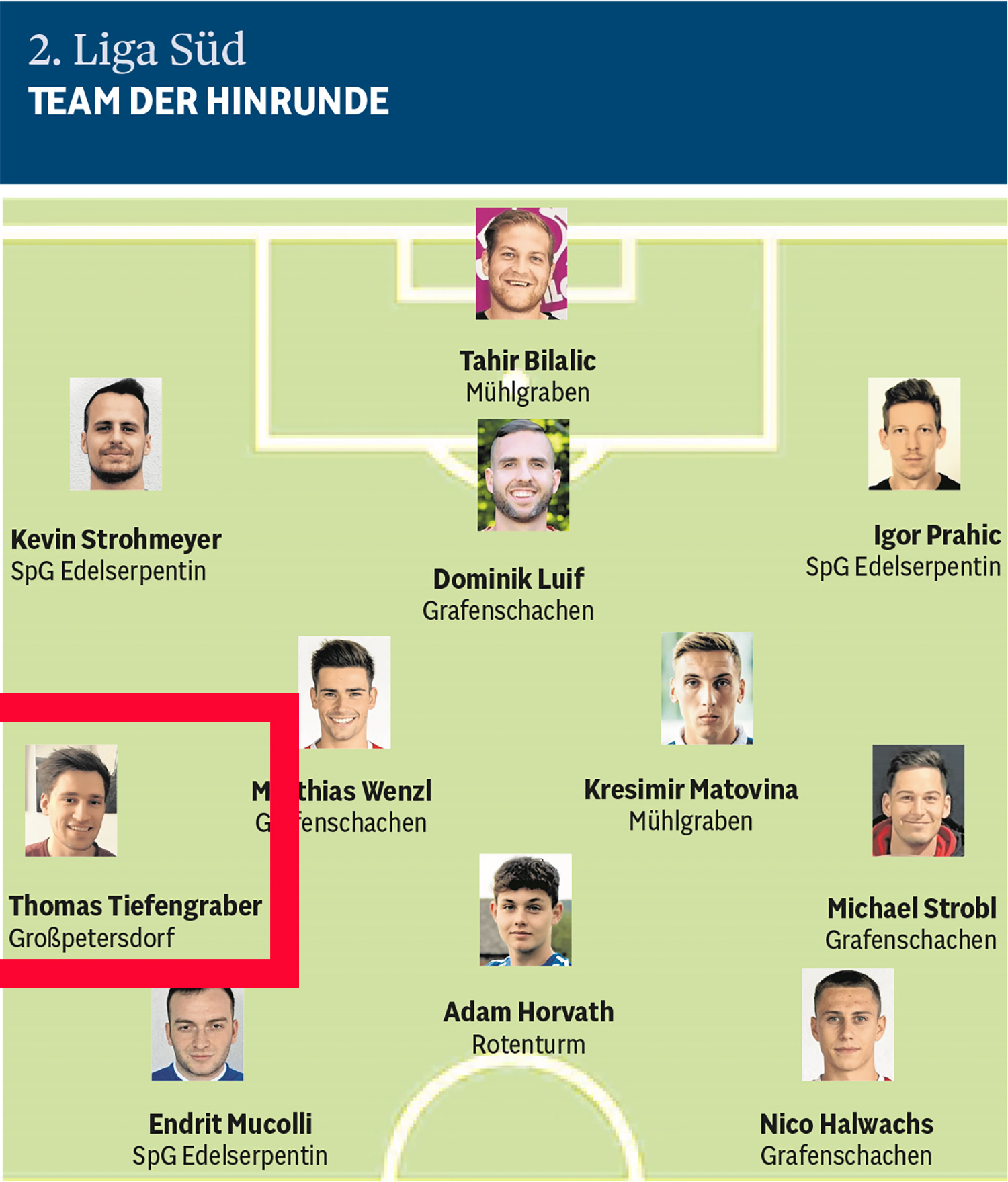 Daneben spielt er aber auch noch selbst als Mittelfeld-Allrounder sehr erfolgreich Fußball beim Zweite Liga-Verein SV Großpetersdorf. So wurde er kürzlich nach Abschluss der Hinrunde von der BVZ in das „Team der Herbstrunde“ der 2. Liga Süd gewählt.