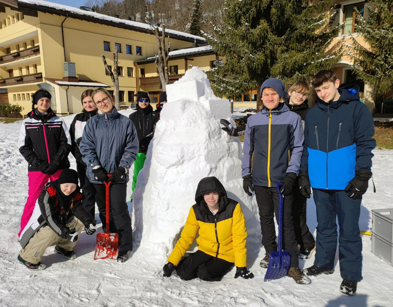 Die ersten vier Tage konnte man sowohl perfekte Pistenverhältnisse als auch perfektes Wetter voll ausnutzen und die Schi- und Snowboardfähigkeiten mit Unterstützung der sehr engagierten und bestens ausgebildeten Begleitlehrer*innen optimieren und verbessern. In der Alternativgruppe standen Wandern, Langlaufen, Iglu-Bau sowie Eisstockschießen am Programm.