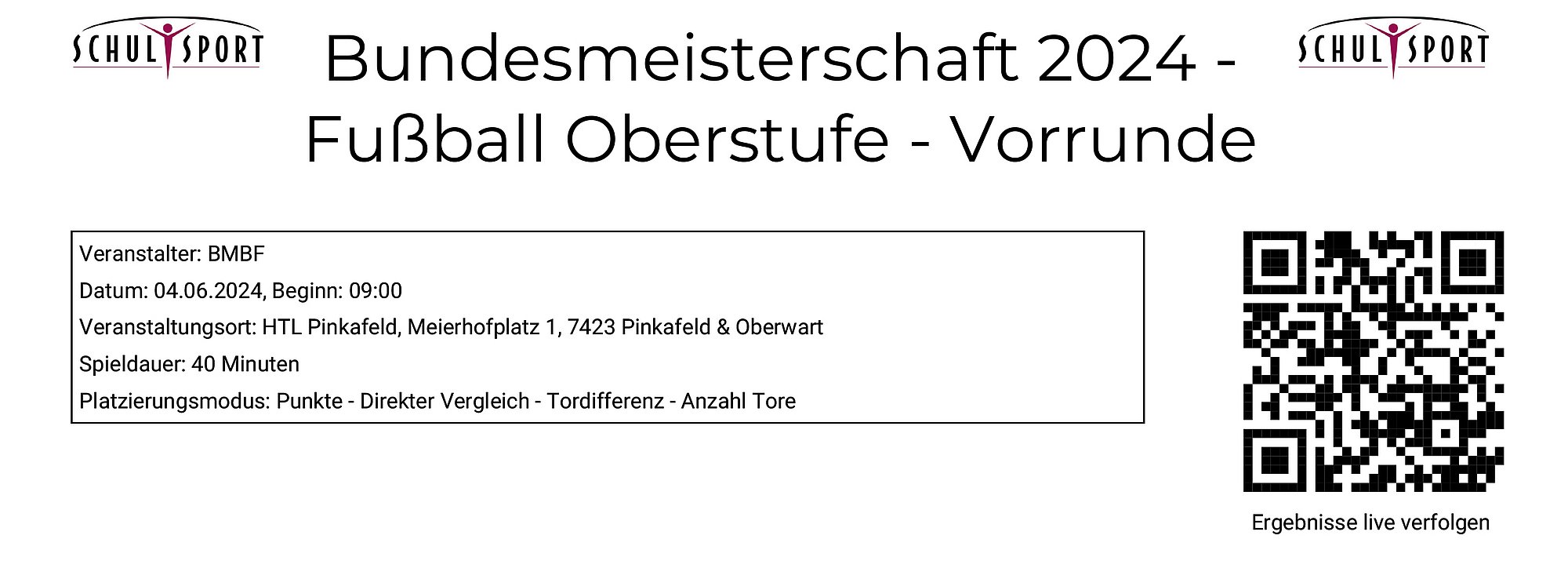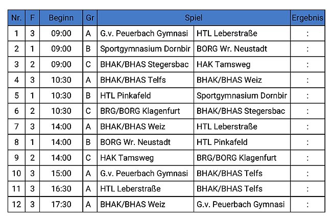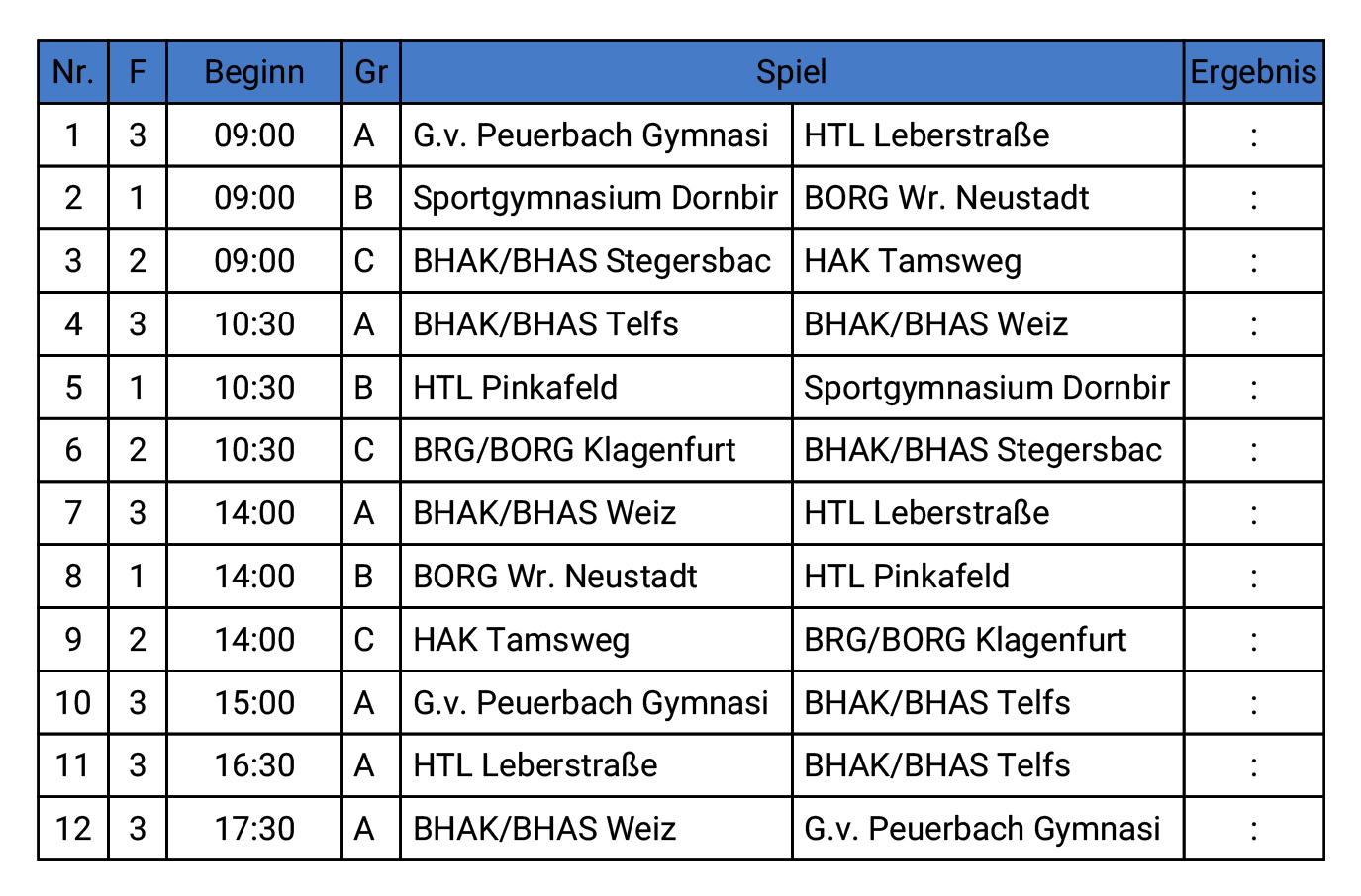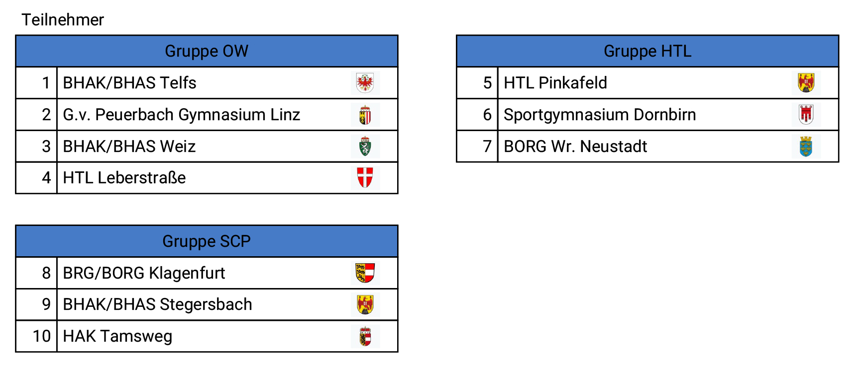 Nach der Anreise und der feierlichen Eröffnung am Montag starten am Dienstag, 4. Juni, ab 9 Uhr in drei Gruppen die Vorrundenspiele. In der Gruppe 1 spielen in Oberwart die BHAK/BHAS Telfs (T), das G.v. Peuerbach Gymnasium Linz (OÖ), die BHAK/BHAS Weiz (Stmk) und die HTL Leberstraße (Wien), in Gruppe 2 in der HTL matchen sich die HTL Pinkafeld (B), das Sportgymnasium Dornbirn (V) und das BORG Wr. Neustadt (NÖ) und in der Gruppe 3 auf dem Kunstrasenplatz in Hartberg kämpfen das BRG/BORG Klagenfurt (K), die BHAK/BHAS Stegersbach (B) und die HAK Tamsweg (S) um den Aufstieg.