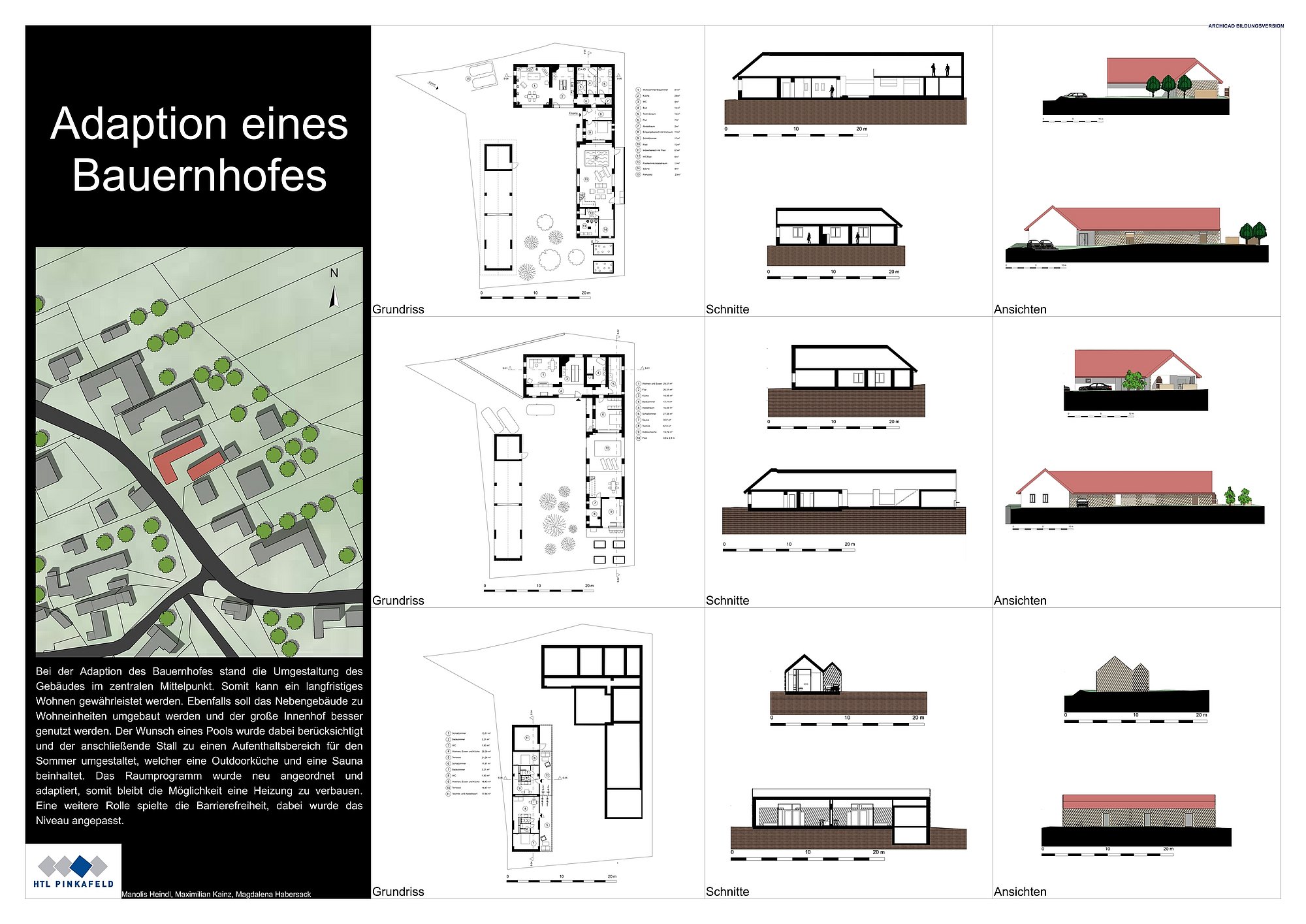 Im Rahmen ihrer Diplomarbeit setzten sich die Schüler:innen der Hochbauabteilung, Magdalena Habersack, Manolis Heindl und Maximilian Kainz mit der Adaptierung eines bestehenden Bauernhofs im Südburgenland auseinander. Im Mittelpunkt stand die Erarbeitung eines neuen Nutzungskonzepts, das die bestehende Gebäudestruktur erhält und gleichzeitig neue Wohn- und Aufenthaltsqualitäten schafft. Vorgesehen waren unter anderem Wohneinheiten (Privat- und Ferienwohnungen) und ein Indoor-Pool-Bereich.